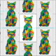 Uma pintura de um gato do arco-íris. O gato tem um teste padrão da pele como um tortie, somente muito mais em cores.