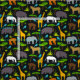 Use este tecido do impressão dos animais do safari para todo o projeto home da decoração para o quarto de uma criança. O tecido caracteriza all over um impressão com gorila, os hipopótamos, os girafas, as zebras e as leoas mostrados em silhueta nas cinzas, no tan, no amarelo e no marrom. As árvores da selva, a grama selvagem e os pássaros azuis adicionam o interesse visual. O fundo vem no preto.