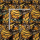 Características deste design do tecido do animal um teste padrão abstrato de repetição de uma asa bonita da borboleta de monarca (plexippus do Danaus) nas cores de alaranjado, de amarelo, o ouro, o preto, o marrom e o branco.