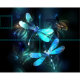Duas libélulas transparentes, luminosas, turquesas, desenhadas artisticamente sobre fundo noturno, com algas e vagalumes luminescentes do lago. Dragonfly brilhante.