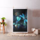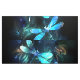 Duas libélulas transparentes, luminosas, turquesas, desenhadas artisticamente sobre fundo noturno, com algas e vagalumes luminescentes do lago. Dragonfly brilhante.