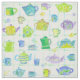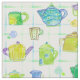 Um tecido alegre decorado com um padrão de bules, potes de café e xícaras acentuados com flores e um fundo de xadrez ilustrado em aquarela. Bonito decoração para quem gosta de café e chá!