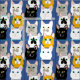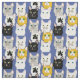Rostos de gato. Seis rostos separados. Um gato cinza, um preto, um laranja, dois brancos e um branco com focinho preto. A cor dos olhos varia de azul a verde. O fundo é um azul médio mudo.