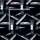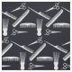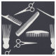 Barbearia clássica de padrão preto-e-branco, cabeleireiro com vários pentes de cabelo, padrão de tesoura. Ferramentas naturais de tratamento de cabelo.