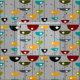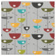 O padrão de meia-lua moderno do Médio século se assemelha a um padrão floral em cores de vermelho escuro, preto, ouro, verde-azul e abacate sobre um fundo de cinza leve com linhas finas.