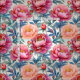 Este tecido apresenta cor d'água, cor rosa e flores de pêssego e folhas verdes.