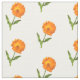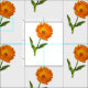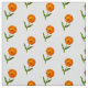 As flores de calendário são escalonadas em "meio tijolo" no tecido. As gotas de chuva aparecem nas pétalas das flores laranja. O caule verde tem duas folhas em lados alternados