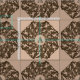 Imagem de um colchete de "ferro em formas brutas" reproduzida 8 vezes para formar um octógono/círculo de folhas. O círculo resultante é replicado em dois círculos concêntricos menores dentro do mesmo. Imagem é tons de marrom-preto. Personalizar com Inicial no centro: tem efeito de sombra 3d. Em segundo plano, um bronzeado rosado, pode ser personalizado. Bloqueio de padrão repetido em linhas.