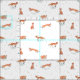 O teste padrão pintado mão da aguarela projetou por Shelby Allison que caracteriza quatro caráteres diferentes da raposa em um fundo do inverno do branco nevado.
