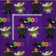Tecido com um morcego voador preto, um morcego múmico verde vestindo bandagens brancas e um gato preto bonito com um chapéu de bruxa laranja. Boo escrito em letras coloridas divertidas.