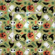 Tecido de Dia das Bruxas em preto, laranja e verde-oliva com um padrão de gatos, abóboras, morcegos, fantasmas, chapéus de bruxa e muito mais.
