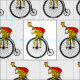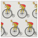 Um desenho engraçado de uma girafa, andando de bicicleta vestida e Papai Noel e carregando um grande saco de presentes de Natal. Se você quiser alguma ajuda para personalizar este design, entre em contato comigo, há um botão para perguntar a este designer, logo abaixo deste texto. A girafa engraçada está andando de bicicleta vintage, penny farthing.