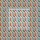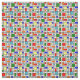 Este tecido tem um design de Bauhaus de uma grade com quadrados e retângulos em vermelho, verde, azul, laranja, azul claro, amarelo e vermelho.