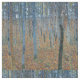 Isto é baseado em trabalhos de arte clássicos de pintura natural de Gustav Klimt, Beech Grove 1, 1902. O trabalho de arte retrata uma floresta densa de pássaros altos e finos, com troncos pálidos marcados por linhas escuras e verticais. A folhagem é representada em tons azuis, verdes e amarelos, acrescentando à cena uma sensação de profundidade e vibração. O chão da floresta é coberto por uma camada de folhas laranja e marrom, criando um contraste impressionante com os troncos mais leves das árvores. A composição geral usa técnicas pontilhistas e impressionistas, dando à imagem uma aparência viva, texturizada. A verticalidade das árvores enfatiza a estrutura serena e ritmada da floresta.