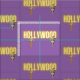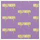 O padrão do tecido divertido apresenta Hollywood em texto neon com dois recortes de fotos de beleza antiga em fundo roxo
