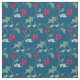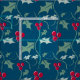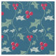 Tecido festivo de folhagem de inverno, com folhas sagradas, de verde-cinza e frutos vermelhos brilhantes de inverno, num fundo azul escuro. Arte gráfica original e design por Sarah Trett para www.mylittleeden.com