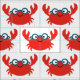Uma mascote de caranguejo feliz com olhos grandes. Ele está posando com suas garras grandes no ar, mas é muito amigável e fofo. Ele gosta de vestir óculos grandes de na moda porque isso lhe dá uma aparência e estilo únicos, então ele pode ser um crustáceo moderno de hipster.