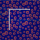 Tecido coberto de vírus influenza transformado em microscópio eletrônico. Colorido em laranja neon num fundo azul escuro.