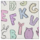 Letras alfabéticas - letras brancas e multicoloridas do alfabeto romano. Letras de seleção com ouvidos, olhos e caudas e letras com rabiscos aleatórios, marcações, grunhidos, manchas e linhas. Letras em tons de rosa, roxo, verde, azul, cinza e marrom. Definir em alfabeto branco+rabisco+rabisco+rabisco+multicolor,criatura+animal+letra+coroa+caudas,cor-de-rosa+roxa+verde+cinza,grunge+manchas+linhas+desenho+rabisco,divertido+jovem+criança+juventude+para,abc+aleatório+letras+padrão+impressão, para+miúdos+menina,bonitinha