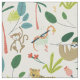 Design de padrão Whimsical que apresenta a exuberante vida vegetal da selva e ilustrações animais, incluindo tigre, papagaio, preguiça, macaco e cobra.