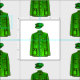 Uma ilustração de um fato verde do presidente Mao Suit ou Zhongshan, apresentado em fundo vermelho e amarelo, representando as cores da bandeira da RPC.