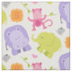 Design de tecido com padrão personalizado apresenta um monograma inicial e padrão de amigos animais da selva de bebês - um pássaro, macaco, elefante e hipopótamo. Este moderno e doce safari temático tem um esquema de cores cor rosa-claro, laranja, verde limão, roxo e cinzas.