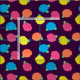 Rosas estilizados em néon brilhante cor-de-rosa, azul, amarelo e coral com folhas verdes neonatais são girados sobre um fundo roxo profundo para criar um padrão floral divertido.