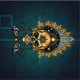 O crânio do Ouro e seus segredos cósmicos. O crânio senta-se majesticamente contra um fundo azul infinito e profundo que recorda os mistérios do universo. Seu ouro brilhante reflete a luz das estrelas, dando-lhe uma aura quase sobrenatural. Um quadro circular paira sobre o crânio, revelando uma cena celestial: um sol radiante cujos raios de ouro perfuram a escuridão, planetas em formação majestosa, e estrelas cintilantes que brilham como diamantes no céu noturno.
