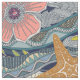 Flores de hibisco tropical, estrelas-do-mar e padrão de ondas, originalmente desenhado à tinta. Disponível em terra, ferro, amora e azul marinho.