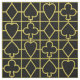 Este tecido inspirado póquer do artesanato tem um teste padrão sem emenda feito de ternos da plataforma de cartão do jogo. As pás, os trevos, os corações e os diamantes couberam junto no esboço do ouro em um fundo preto. Este tecido olhará grande em sua sala de jogo se você ama algum tipo de jogo de cartas, do póquer ao euchre, à ponte, ao whist ou ao vinte-e-um. É igualmente perfeito para um casamento temático de Las Vegas.