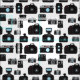 Tecido funky impresso com câmaras retrógradas desenhadas à mão e câmaras brancas e pretas modernas