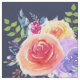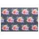 Tecido com um bom buquê de rosas de aquarelas com galhos, folhas e galhos, todos juntos num arranjo floral colorido. fundo azul marinho.