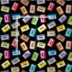 As cassetes de áudio coloridas têm um padrão perfeito. Cor de fundo personalizada.