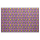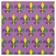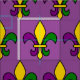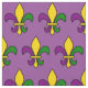 Tecido com um padrão sem soldadura de pulgas (flores de lilly) nas cores de New Orleans Mardi Gras; design roxo, ouro e verde sobre fundo roxo