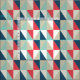 Padrão geométrico muito tenso com triângulos azuis, vermelhos e beges.