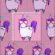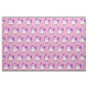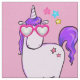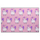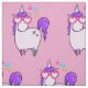 Tecido patenteado com desenho branco de um legal e funk unicórnio cor-de-rosa, que tem uma mana e uma cauda roxas. Esta criatura fofinha está vestindo óculos de sol em forma de coração e é decorada com estrelas pequenas. Fundo rosa.