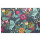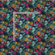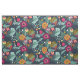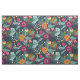 Um padrão floral tropical brilhante em tons de azul, verde, laranja e rosa quente.