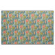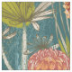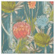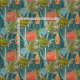 Um padrão botânico abstrato africano em tons de laranja, burgundy, azul e verde sobre fundo azul lacrimogêneo.