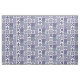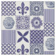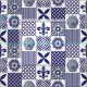 tecido azul-boho e branco-patchwork, modelado com frascos-gengibre, girassóis, pulgas-de-la e azulejos-de-gengibre-marroquinos.