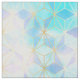 As formas geométricas do cubo são colocadas em camadas em um padrão e coloridas em tons alternados de azul pastel, rosa e roxo que lhe dão uma aparência de vidro iridescente. As formas são esboçadas em dourado falso.