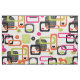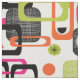 Um impressão moderno, brilhante, brilhante, mas na moda, inspira um meio século moderno, com padrões geométricos. Tecido rosa, laranja, verde, preto e branco; disponível em uma escolha de estilos de tecido e corte a comprimentos para atender às suas necessidades de costura e artesanato.