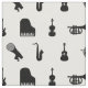 Este design de padrão de música preto e branco apresenta ícones variados de instrumentos musicais, incluindo guitarras, saxofone, trompete, piano, violino, microfone e tambores. Perfeito para quem ama instrumentos musicais, orquestra, banda,