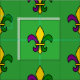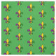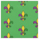 Tecido com um padrão uniforme com um pulmão-de-lis; amarelo, roxo e pulgão-de-lis verde nas cores da celebração do New Orleans Mardi Gras; em um fundo verde
