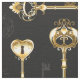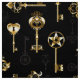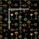 Padrão perfeito de chaves antigas, douradas e silhuetas em fundo preto.