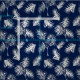 Tecido tropical apresentando um padrão de folhas brancas de palma em um fundo azul-da-noite.