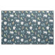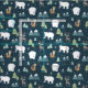 Tecido com um padrão festivo caprichoso. Ursos polares, renas, árvores, raposas e flocos de neve. Num fundo verde escuro.