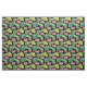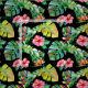 Um tecido colorido apresentando um adorável padrão tropical havaiano com Hibiscus Rosa Floral e Palm Leaves em um fundo preto. O padrão perfeito para uma vibe de verão ou uma casa de praia.