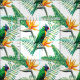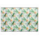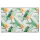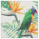 Papagaio colorido bonito e flores amarelas exóticas sobre fundo branco. Modelo de tecido personalizável