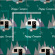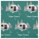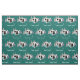 Personalize este tecido de trailer retrô divertido com seu próprio texto, se desejado. Padrão de deslocamento repetido de imagens do trailer do acampamento, texto do script "Campers felizes" e plano de fundo da montanha. Reboque azul e branco de turquesa em azul verde escuro.