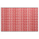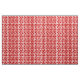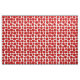 Este tecido tem um design moderno do século médio de pinhões vermelhos feitos com círculos vermelhos e "raios" pretos sobre um fundo branco.